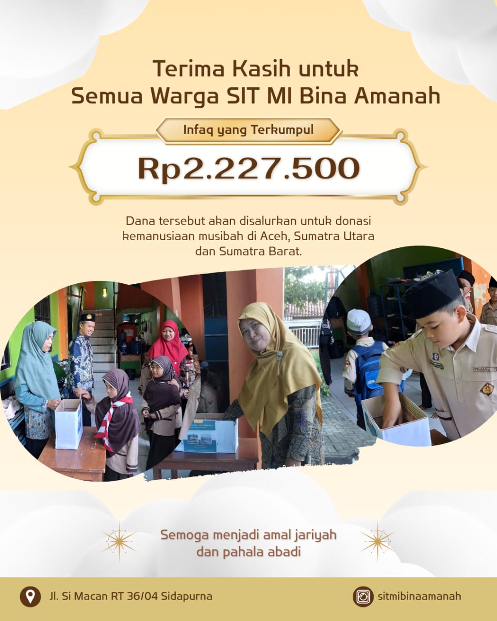 Aksi penggalangan dana ini merupakan cerminan bahwa MI Bina Amanah tidak hanya berfokus pada kecerdasan akademis, tetapi juga pada pembentukan karakter yang peduli dan bertanggung jawab.